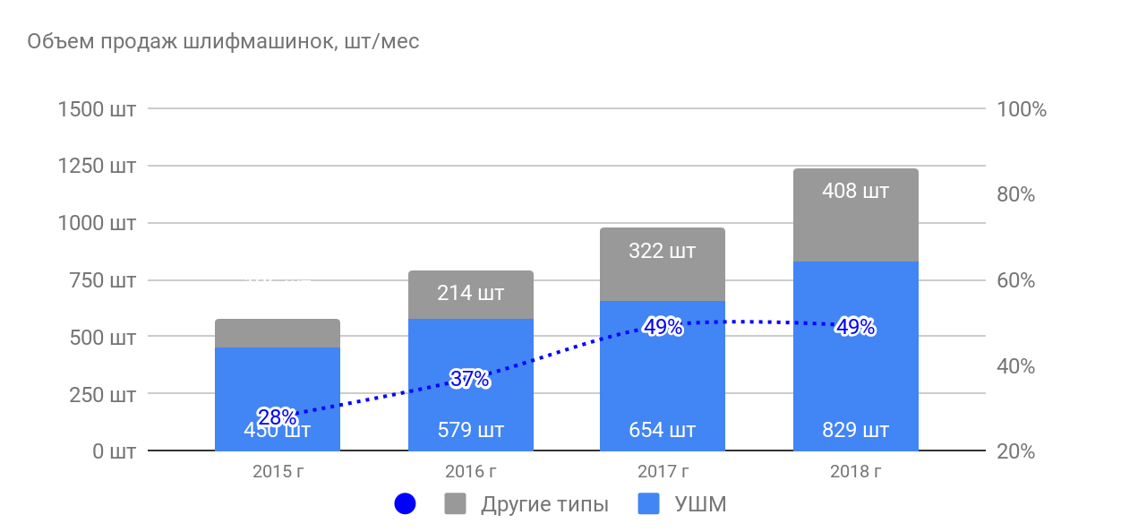 Около 67% всех продаж припадает именно на углошлифовальные машины (болгарки).