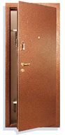 Дверь снабжается двумя замками (один ригельный) и ручками с двух сторон. Снаружи отделывается винил-кожей, а изнутри ламинированным ДВП.